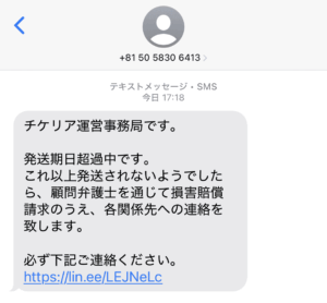 先払い買取業者チケリア運営事務局から警告SMSが一斉送信されました