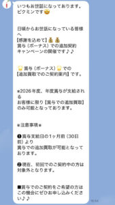 先払い買取業者 ピクミンから、「ボーナスでの追加契約キャンペーン」といった勧誘メッセージがLINEで送信されています。