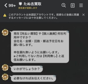 先払い買取たぬ吉から送られてくるメッセージのスクショ
