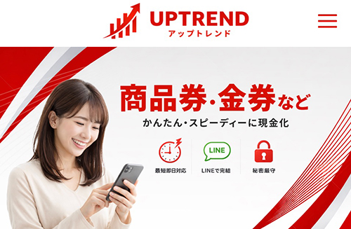 アップトレンドは商品券やギフト券などをオンラインで買取査定し、査定額を銀行口座へ振り込む先払い現金化サービスを営む業者です。