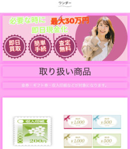 ワンダー買取は商品券やギフト券、収入印紙などの金券をオンラインで買取査定し、その査定額を即日利用者の銀行口座へ振り込む「先払い現金化サービス」を運営しています。